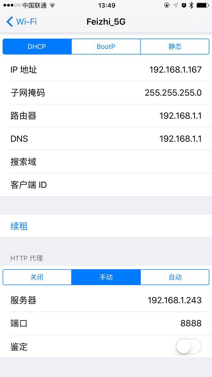 6:在iOS的设备中,打开设置-WiFi-选择连接的WiFi,按下图设置HTTP代理,输入电脑上的局域网IP和Fiddler/Charles中设置的端口 8888.