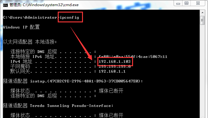 然后查询本机的局域网IP,在cmd命令窗口中,输入ipconfig,找到IP
