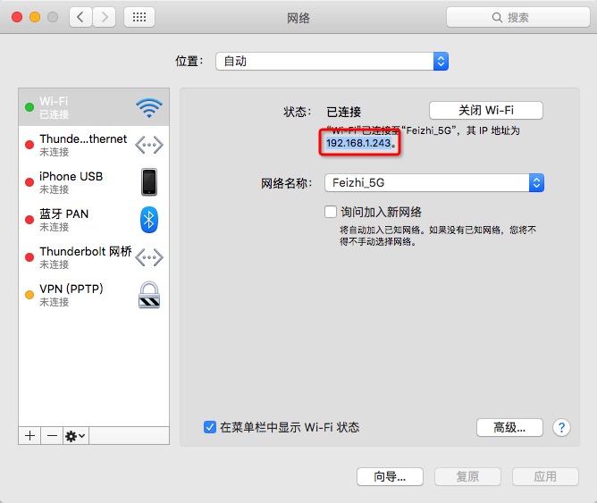 在系统偏好设置-网络中,找到本机的局域网IP