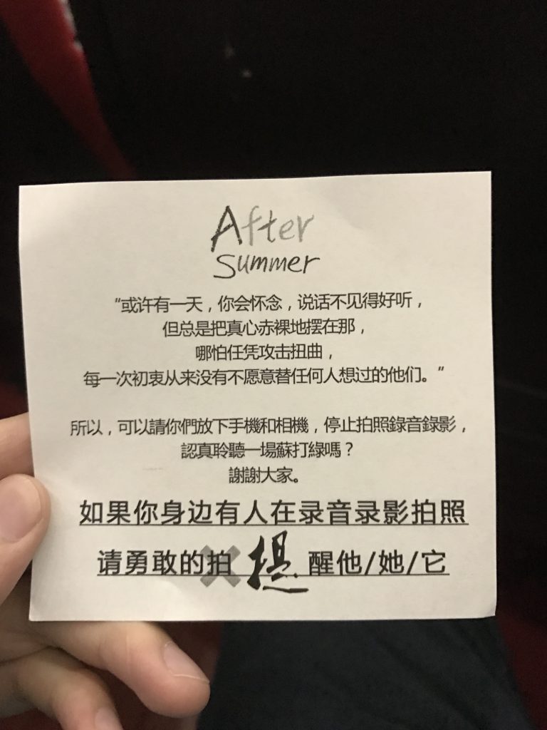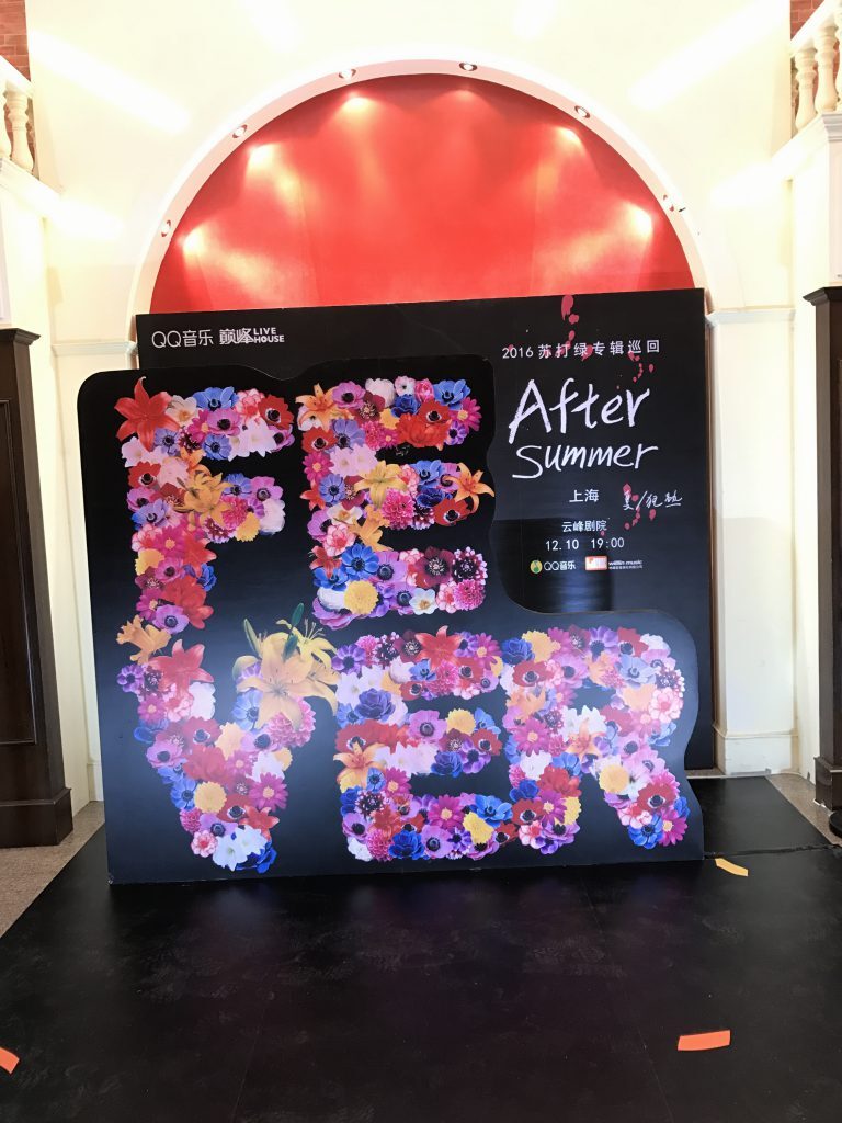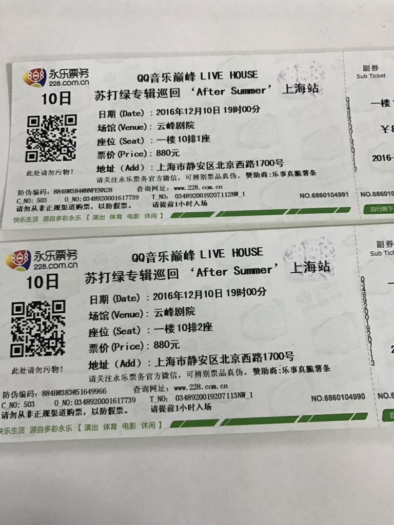 大概是从去年11月左右开始喜欢苏打绿的,听《冬 未了》专辑之后,一发不可收拾,重新把之前的专辑也重新刷了一遍,又把所有Live的现场版也刷了一遍,变成了脑残粉。喜欢苏打绿的粉丝也一定知道,现场版的编曲会更嗨,一直想参与一次演唱会,可惜传出要休团三年,休团之前会在整个台湾巡回一遍之前的所有专辑,每场一张,也很想去台湾,可惜政策问题,户口所在地暂时还不能台湾自由行。幸好9月传出In summer会来大陆,五个城市刚好有上海。上海的票最难求,也终于做了一个脑残粉,880的票前十排座位炒到了2200一张,买了两张跟女票一起来看,果然值回票价,这次演出是小场馆,不到2000人,大概也就IMAX影厅差不多大,离舞台特别近。